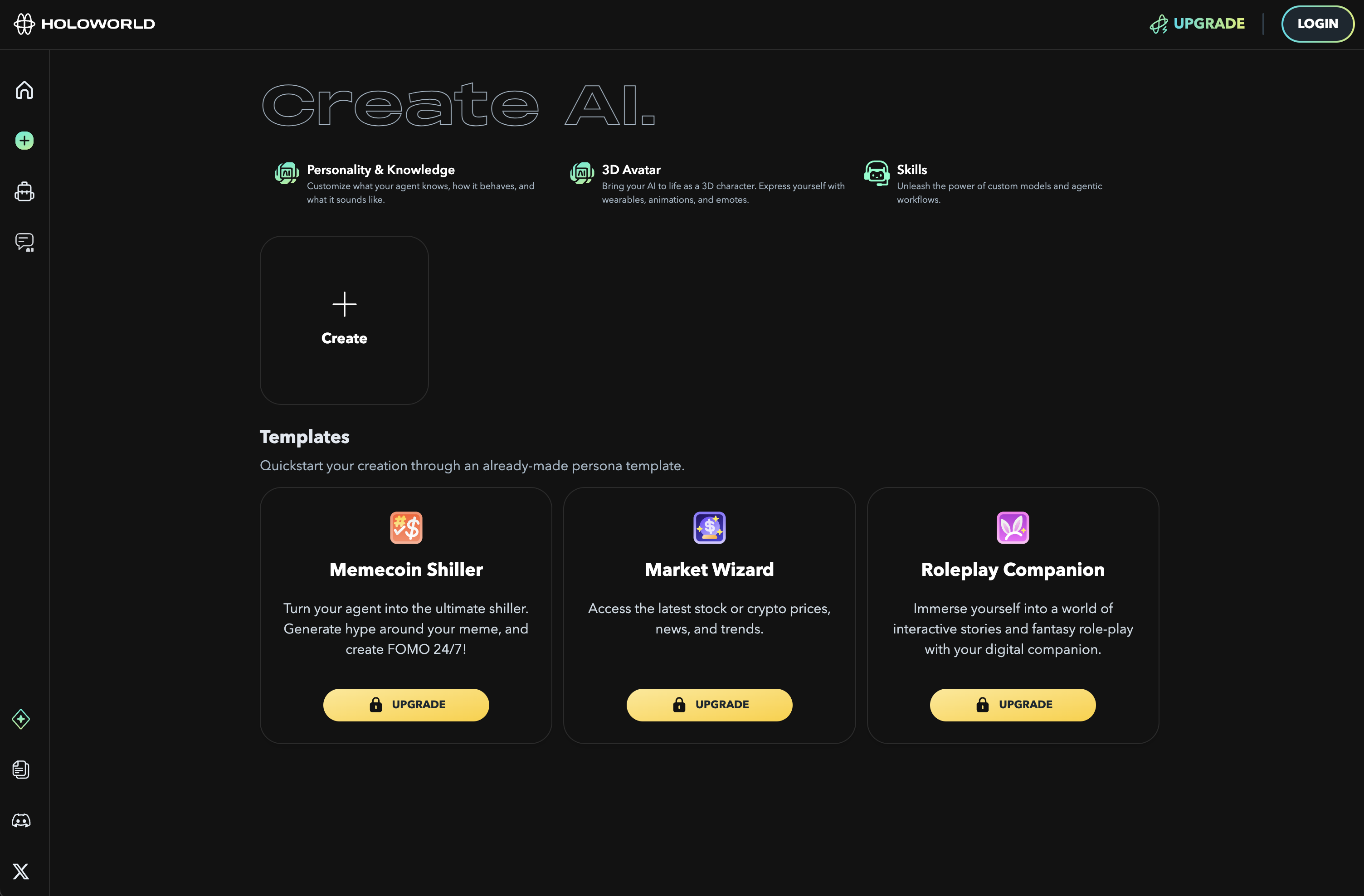 Enter through "Create" on the left sidebar. You can get started creating an AI character from scratch, or quickstart through an AI character template.